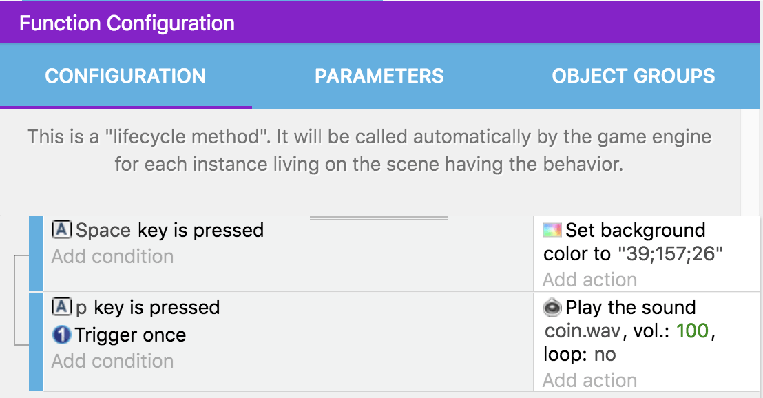 Making custom behaviors for your game objects might seem at the beginning more complicated than making events directly in the events sheet. Behaviors are more constrained and need you to think more carefully about how your object works and what actions/conditions should the behavior expose. But custom behaviors are also a very powerful tool, allowing you to encapsulate your logic inside your objects, and keep the events sheet of your scene as minimal as possible.