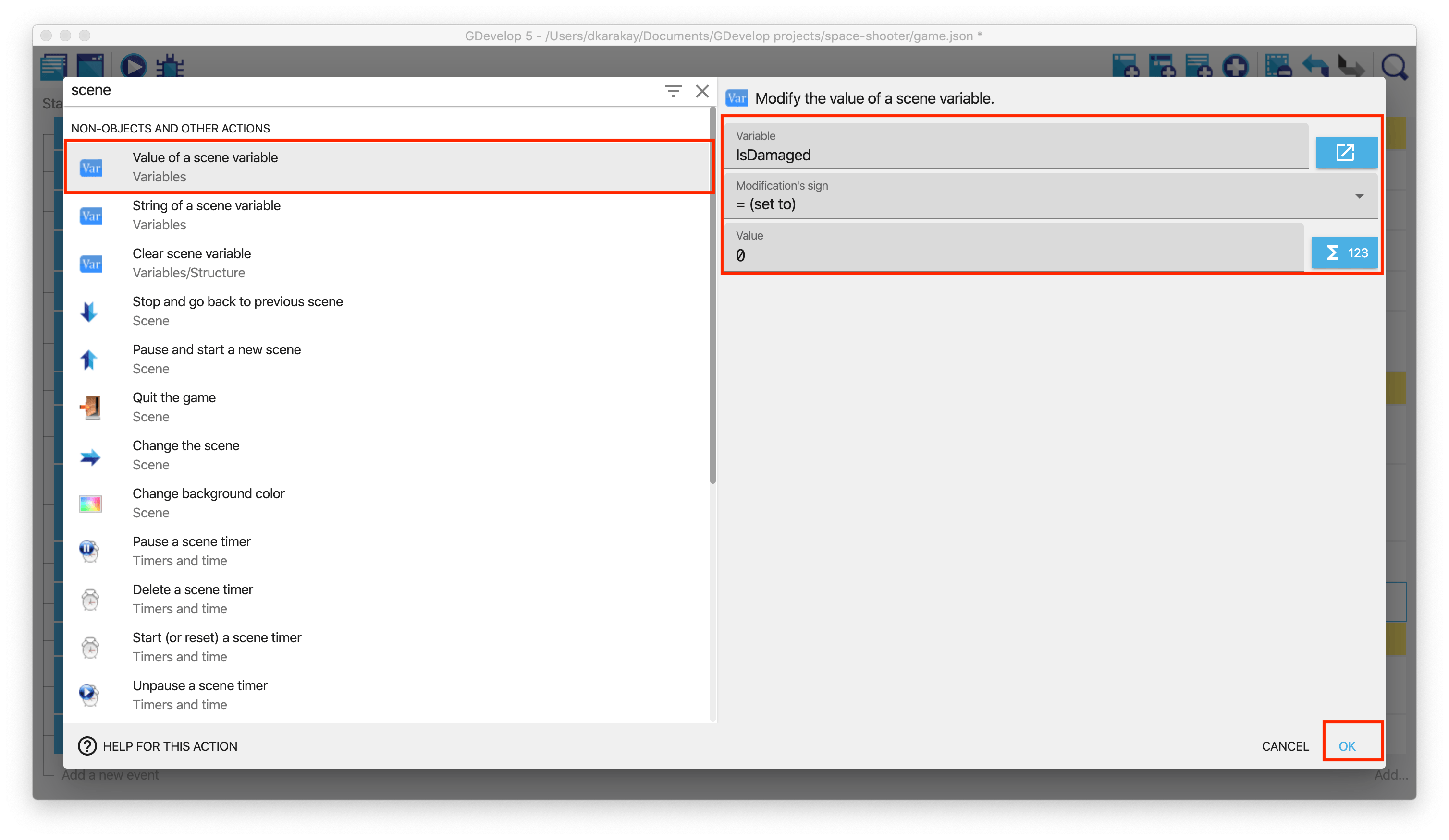 Now, create an action and type "variable" on the search bar. Then, select Value of a scene variable and click on the button next to the action details. In this window, create a scene variable called "IsDamaged" and give its initial value 0. Then click apply.